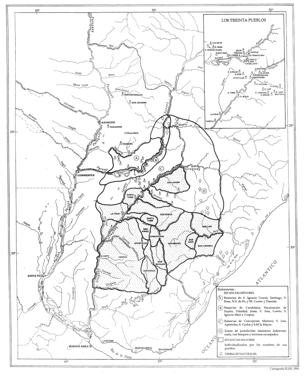 MAEDER, Ernesto J. A. & GUTIERREZ, Ramón. Atlas Territorial y Urbano de las misiones jesuíticas de guaraníes. Argentina, Paraguay y Brasil. Sevilla, Instituto Andaluz del património histórico, 2009. P. 14